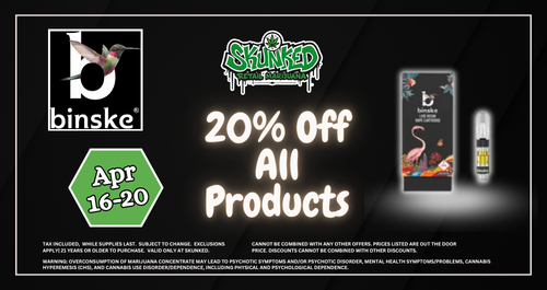 β¨ Binske 20% OFF - 4/20 Week Deals at Skunked πΏπ₯ Step into 4/20 week with elevated options from Binske! From April 16th through April 20th, enjoy 20% OFF all […]