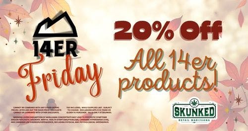 Every Friday, score 20% OFF 14er canned bud, carts & concentrates. Start your weekend right with 14er vibes only at Skunked.