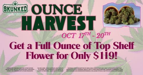Stock up on your favorite strains and keep your stash fresh without breaking the bank. Available Oct 17–20 at Skunked Dispensary. Some exclusions may apply.